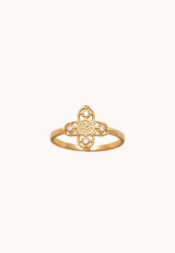 Der 18-Karat-vergoldete Justine-Ring ist ein Sinnbild für Weichheit und Stärke und wird Sie mit seiner Qualität und Widerstandsfähigkeit verführen. Die 5 Mikrometer dicke Beschichtung garantiert Ihnen eine einzigartige und langlebige Vergoldung. Dieser Ring besteht aus vier sauber angeordneten Steinen, die ein Kreuz um die Mitte aus Mikroperlen bilden, und ist mit kubischen Zirkonia verziert. Dieses in verschiedenen Größen erhältliche Schmuckstück ist garantiert nickel- und allergiefrei und wird aus recyceltem Gold hergestellt.